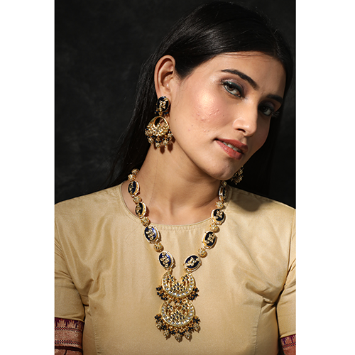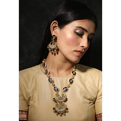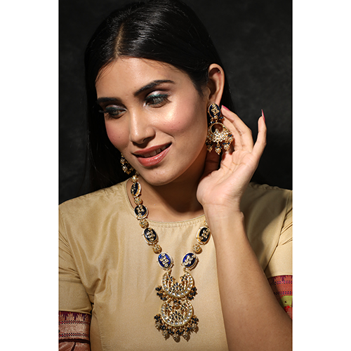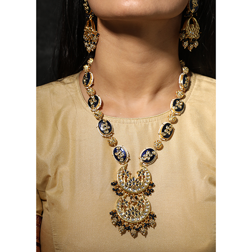 - Oval blue meenakari jadtar line with double layer chand jadtar necklace