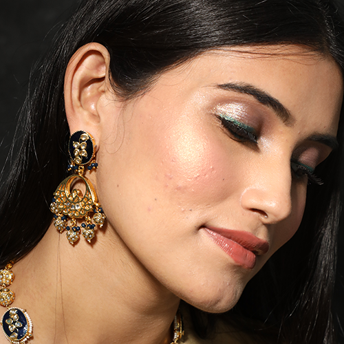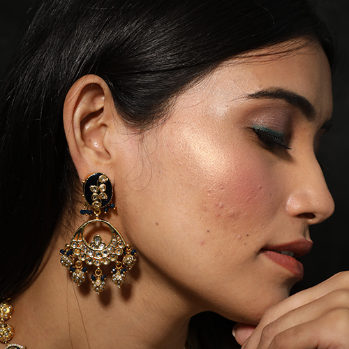 - Blue meenakari jadtar top with chandbali with golden balls earrings