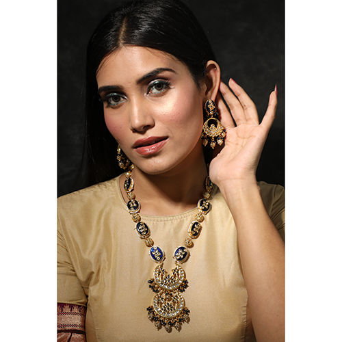 - Oval blue meenakari jadtar line with double layer chand jadtar necklace