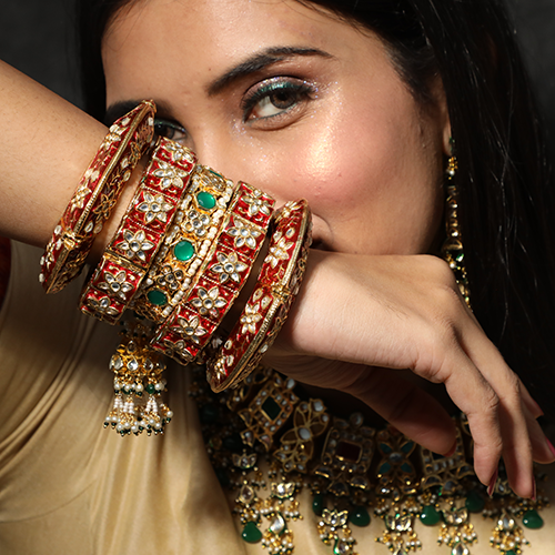 - Green kundan with pearls framing bangle