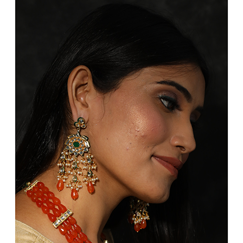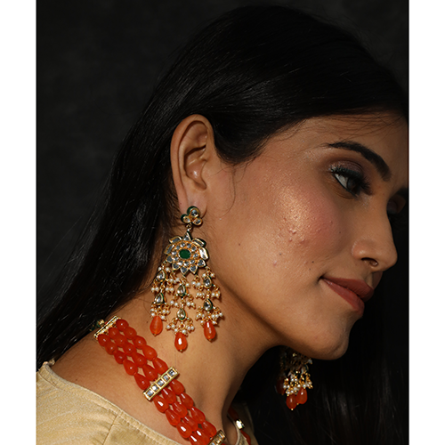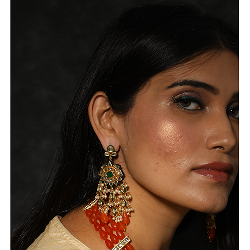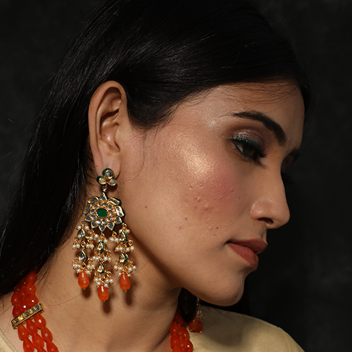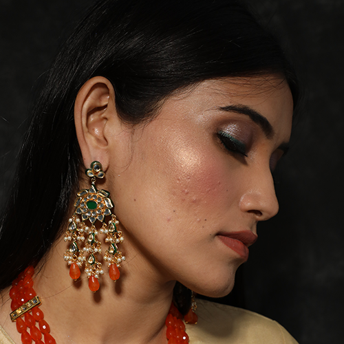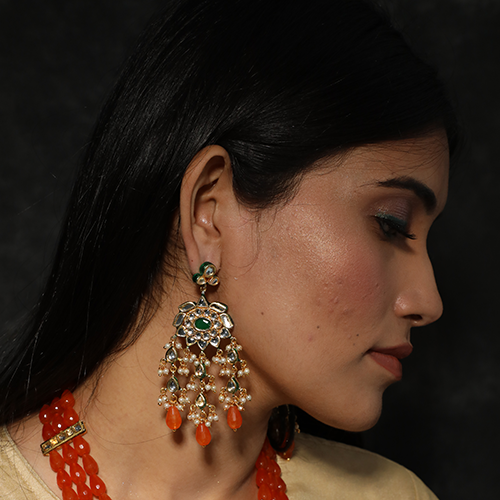 - Green kundan stone gold plated earrings with orange drops