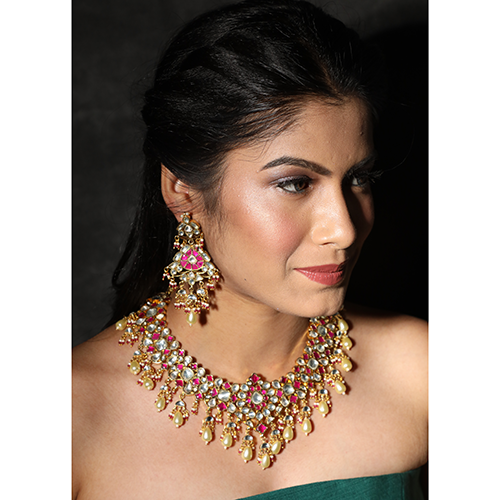 - Semi precious turquoise carved stone gold plated kundan and semi precious pearl drops