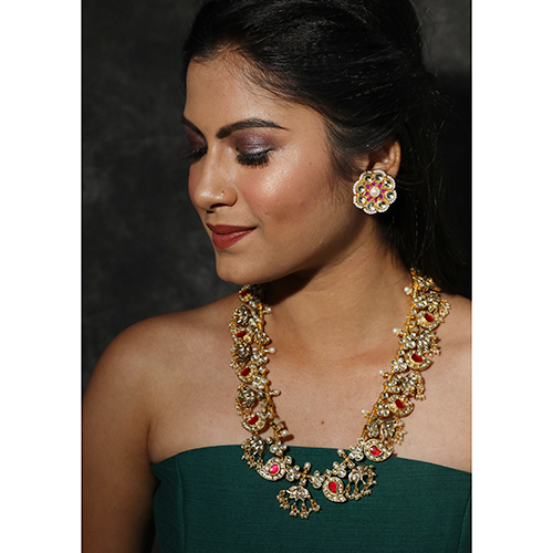 - Red patchiand kundan with semi precious jade drops