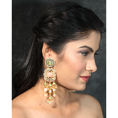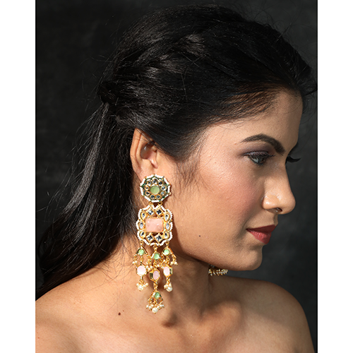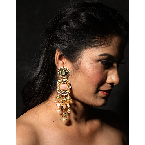 - Rose quartz and kundan stone long evening earrings